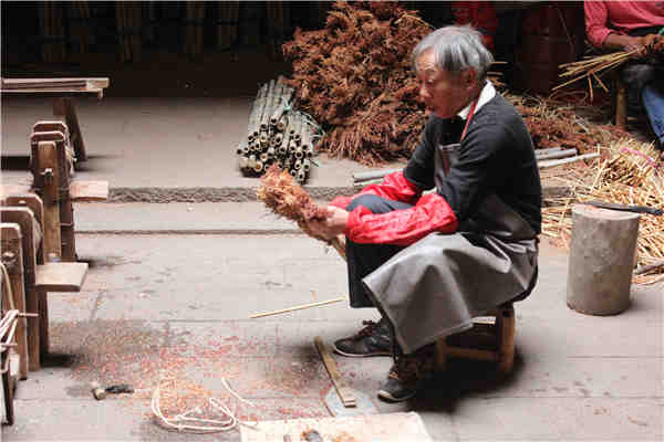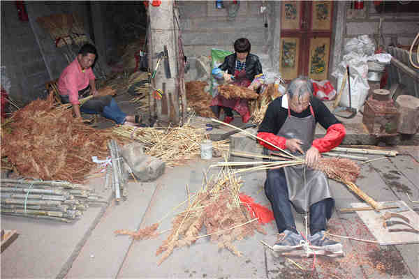 然而随着经济的发展,不少土地被大面积开发,土地少了,种高粱的田地也少了,要买原材料只能到西南,东北地区买,成本就高了。后来村民们渐渐转行,仅有为数不多的几户人家仍在坚持,现陈淑椵这家常年在做,并且在不断更新,一家三代人也连续传承,他从16岁学扎扫帚,至今70岁了,半个世纪以来从无间断,并表示只要还做得动,就会一直坚持下去,一代一代传承,老祖宗传承下来的手艺,千万别丢了,不然很可惜。