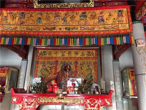 金苍绣,也称盘金绣、金葱绣,绣品是在罗缎的底子上面用金丝线绣出各种美妙的纹样,是闽南泉州独有的刺绣技艺,多用于宗教用品。主要有庙宇绣品、道场绣品和阵头绣品,如佛服、绣佛、凉伞、幢幡、龙蟒桌裙、阵头绣旗等等,朝服、戏服(包括木偶戏衣)、喜庆绣幛等也有用金苍绣的。其中,尤以龙蟒桌裙最能体现金葱绣的特点和工艺,龙蟒图案立体感强,龙头等部位突出,鳞片可以片片立起,栩栩如生。此外,一些婚庆和寿筵等场合也用金苍绣品装饰。