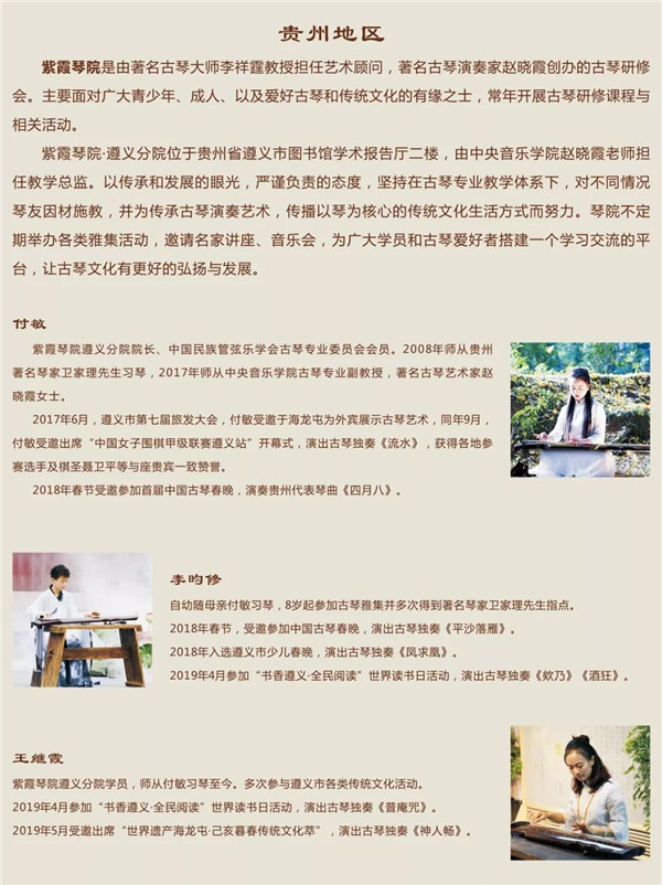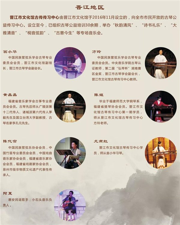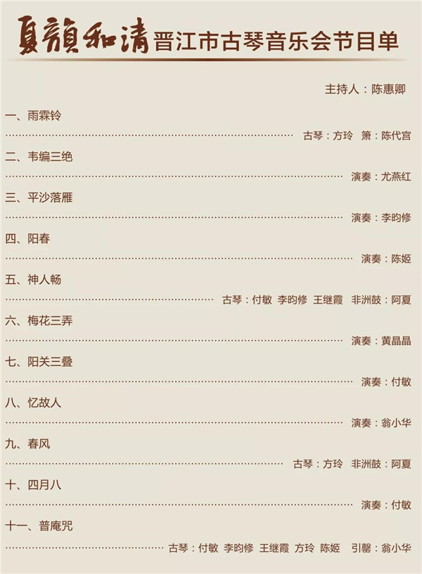 执行 晋江市文化馆 晋江市民族乐团 演出 紫霞琴院遵义分院 晋江市文化馆古琴传习中心 ▼ 时间 2019年7月28日19:30