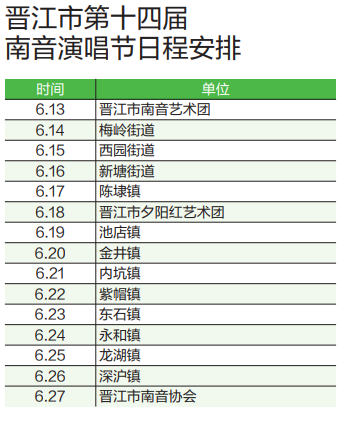 为了进一步提高人民群众非物质遗产保护意识,传承、弘扬中华优秀传统文化,推进国家公共文化服务体系示范区建设,倡导“非遗”融入生活、服务社会,促进民间文艺社团的提高和发展,晋江市文旅局、文联联合举办了本次的南音演唱节。除首场外,皆在晋江文化中心南音厅,演出时间晚7时30分至9时30分。