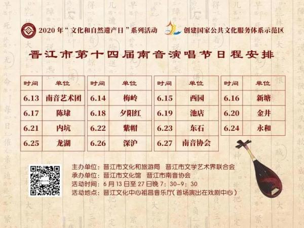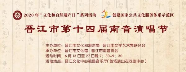 承办单位:晋江市文化馆、晋江市南音协会演出时间:6月13日至27日19:30—21:30