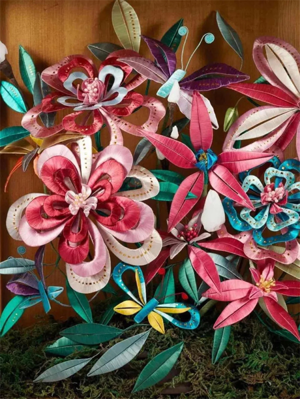 随后,大家纷纷动手实践起来,将彩色丝线一圈圈地缠绕在铁丝和卡纸上,形成花朵、叶子的形状。