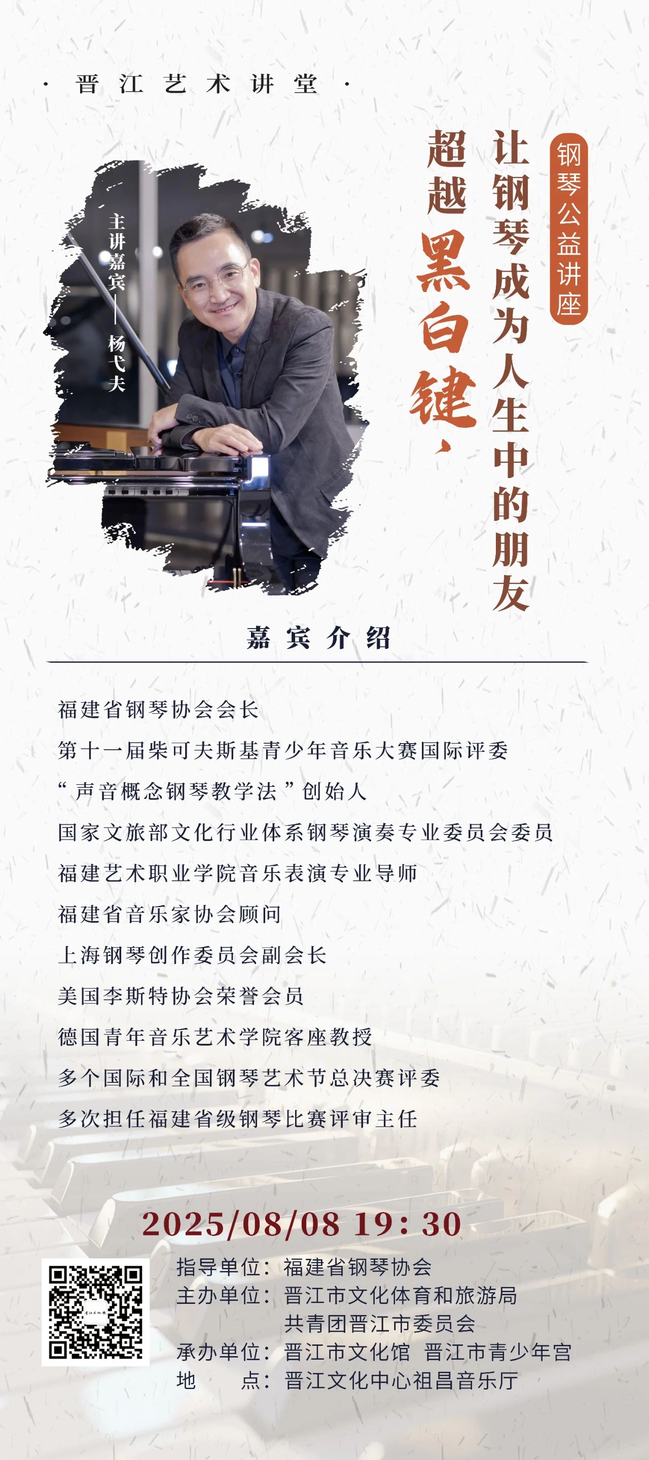 8月8日(星期五)19:30,福建省钢琴协会会长杨弋夫老师将带来2025年第1期晋江艺术讲堂《超越黑白键,让钢琴成为人生中的朋友》钢琴公益讲座,让更多人感受音乐之美,体验艺术之趣,欢迎广大市民朋友参加。(文末附抢票二维码)