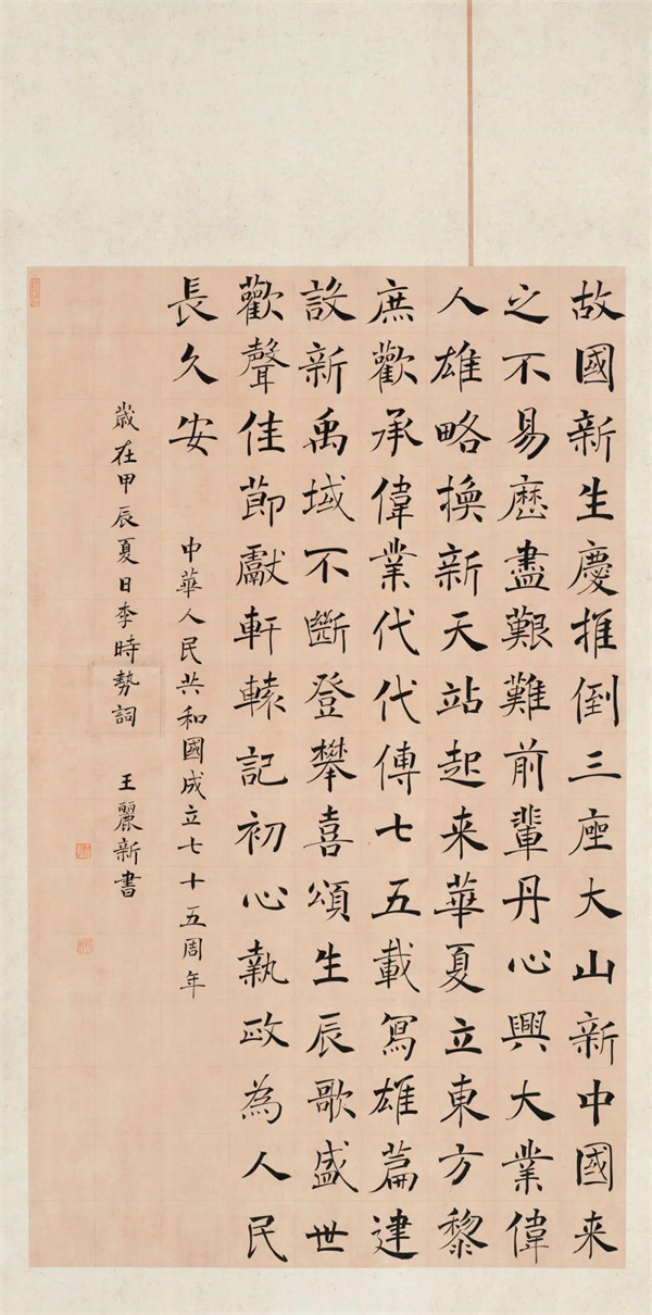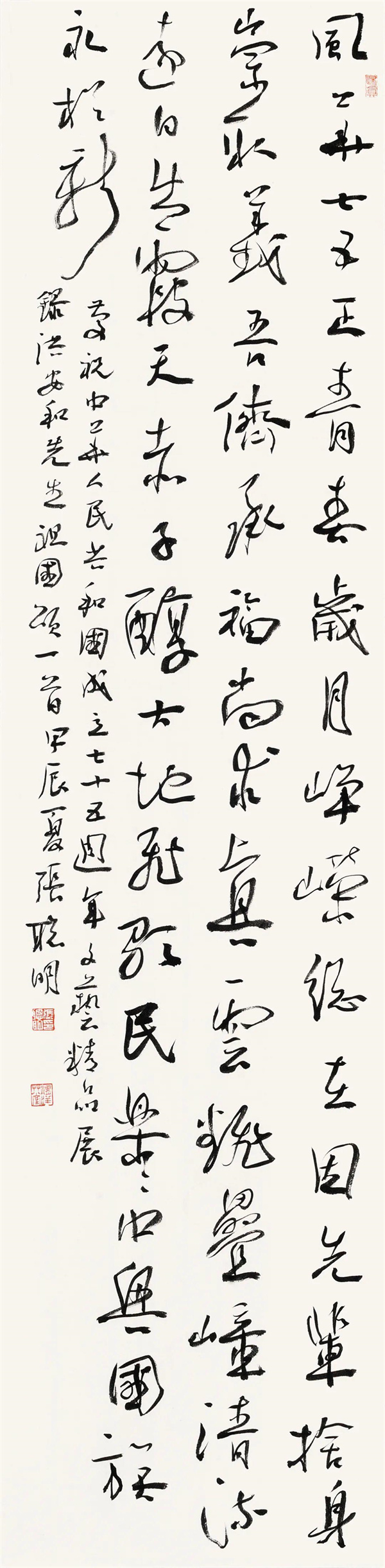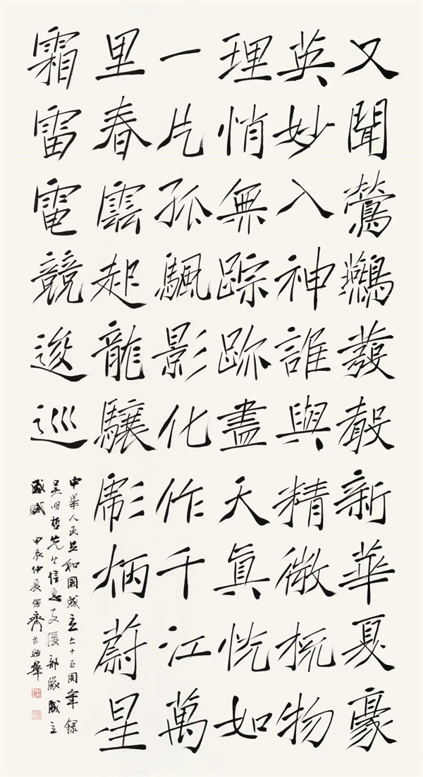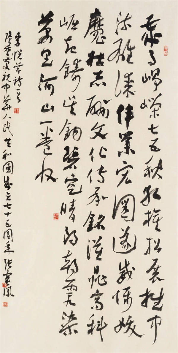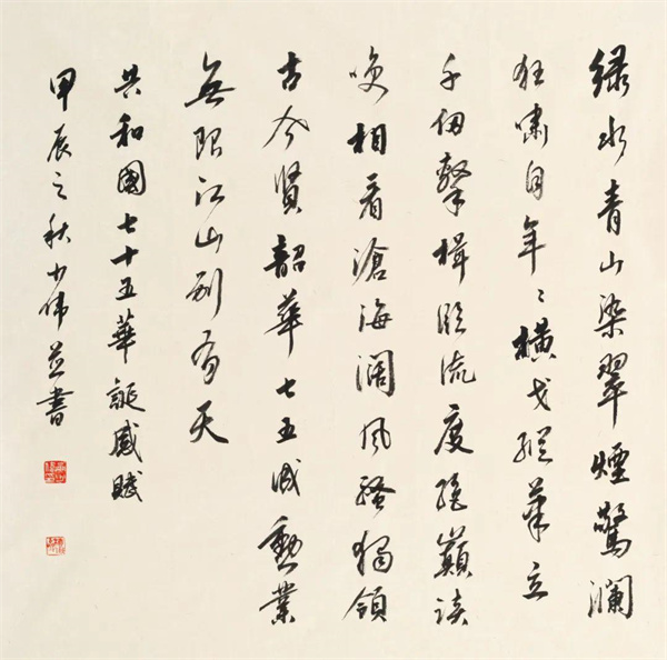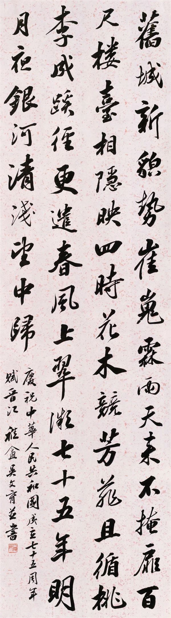 泰岳国基铸,南海固遐疆。江河嬴育繁盛,天地荡春光。玉宇琼楼林立,绿水青山叠翠。锦卷展辉煌。『双百』任龙舞,砥柱领征航。