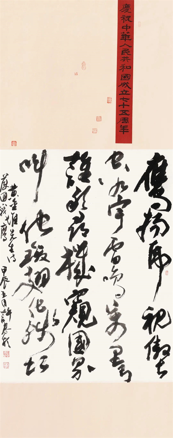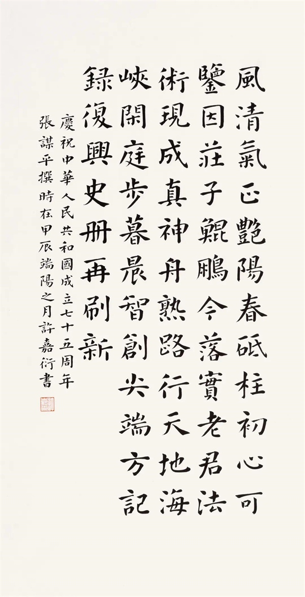 承伟业,代代传。七五载,写雄篇。建设新禹域,不断登攀。喜颂生辰歌盛世,欢声佳节献轩辕。记初心、执政为人民,长久安。